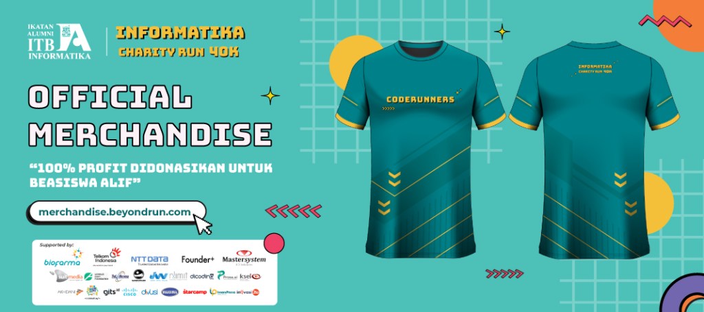 Dengan menambah add-on mulai dari Rp 300.000, Anda bisa ikut berkontribusi ke program Beasiswa ALIF dan mendapatkan jersey eksklusif Informatika Charity Run 40K. Seluruh keuntungan dari penjualan merchandise akan ditambahkan sebagai bagian dari donasi Beasiswa ALIF.